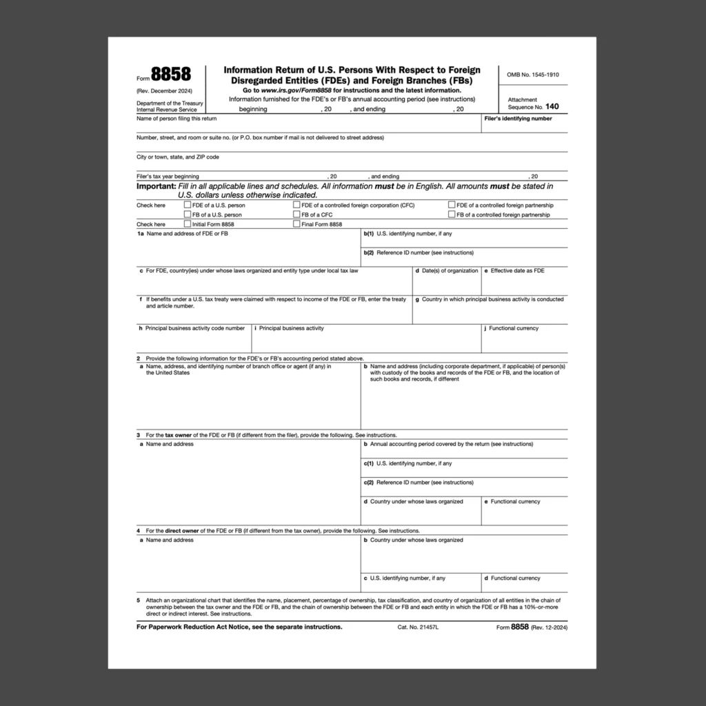 Form 8858 reports the activities of a foreign disregarded entity (FDE) or a foreign branch. Think of it as a schedule attached to your regular tax return—similar to Forms 5471 or 8865—but specific to foreign disregarded entities.
