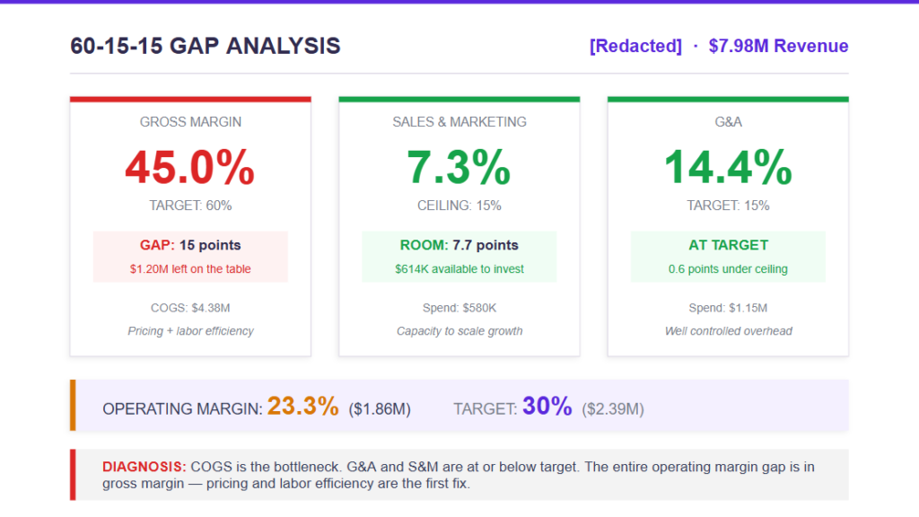 It’s the operating standard we use across every business in our portfolio. 60% gross margin, 15% sales & marketing, 15% G&A = 30% operating margin. Your assessment shows you exactly where you sit against this standard and what’s pulling you off target.