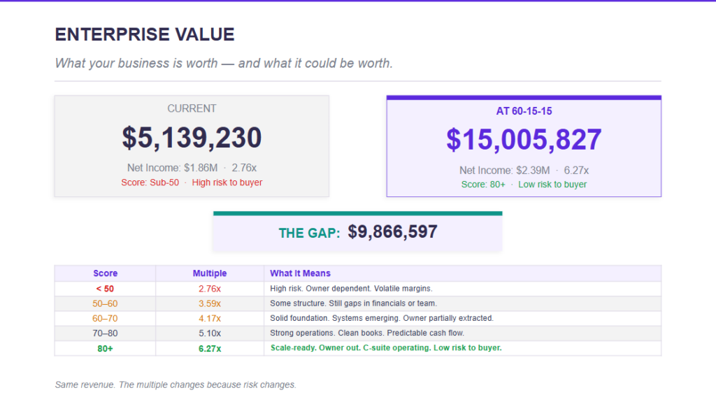 Most founders have no idea what their business is actually worth — or what it could be worth at 30% operating margin. We show you both numbers. The gap between them is usually the most important number in the entire assessment.